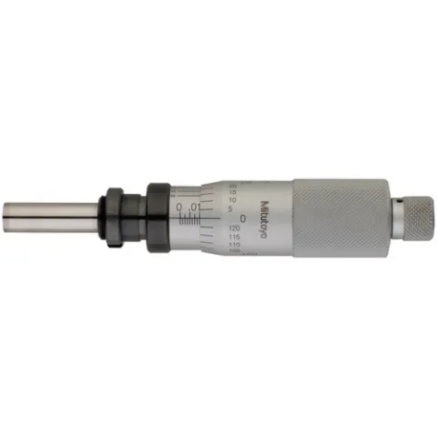 A high resolution, non-digital Mitutoyo micrometer head with M12 clamp-nut stem and heavy-duty Ø 8mm non-rotating spindle fitted with flat tungsten-carbide tip.  The differential screw mechanism in this Mitutoyo micrometer head provides extra-fine feeding of the spindle for highly accurate adjustments and measurements. Its non-rotating spindle eliminates torque for added precision. The spindle has a flat measuring face constructed of carbide and is lapped for lasting precision.