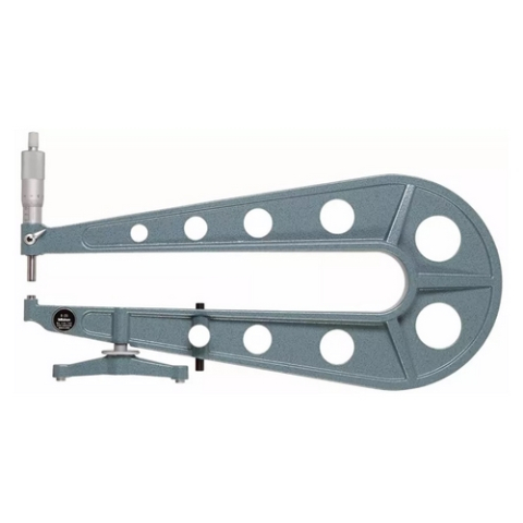 A Mitutoyo non-digital micrometer provided with a deep frame to enable measurement of sheet metal thickness farther from the edge of a sheet than is possible with a standard micrometer. A ratchet stop guarantees repeatable measurement.