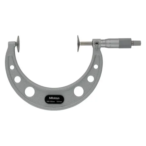 The Mitutoyo mechanical disk micrometer uses flat disks made with hardened steel in Mitutoyo Japanese facilities to measure lengths of spur and helical gears. The flatness and thinness of the disks allow for reliable measurements in tight spaces. A ratchet-stop mechanism provides uniform pressure on a workpiece for precise, repeatable measurements and eliminates over-speed error.