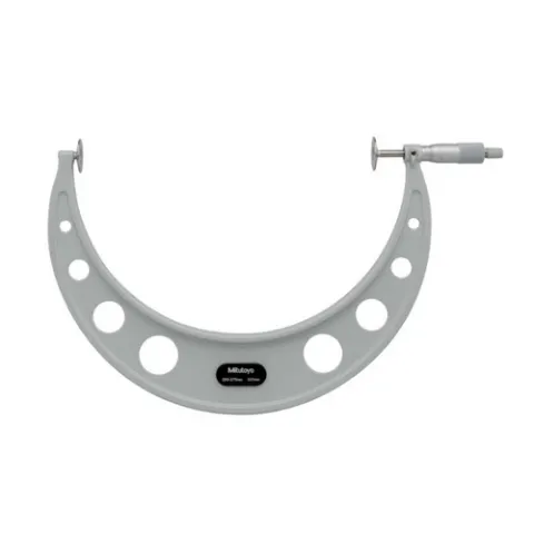 The Mitutoyo mechanical disk micrometer uses flat disks made with hardened steel in Mitutoyo Japanese facilities to measure lengths of spur and helical gears. The flatness and thinness of the disks allow for reliable measurements in tight spaces. A ratchet-stop mechanism provides uniform pressure on a workpiece for precise, repeatable measurements and eliminates over-speed error.