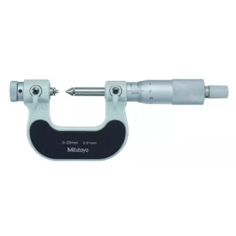 The Mitutoyo screw thread micrometer uses optional V-Anvil and conical spindle inserts interchangeably to precisely measure pitch diameters of metric or unified screw threads. A ratchet-stop mechanism provides uniform pressure on a workpiece for precise, repeatable measurements.