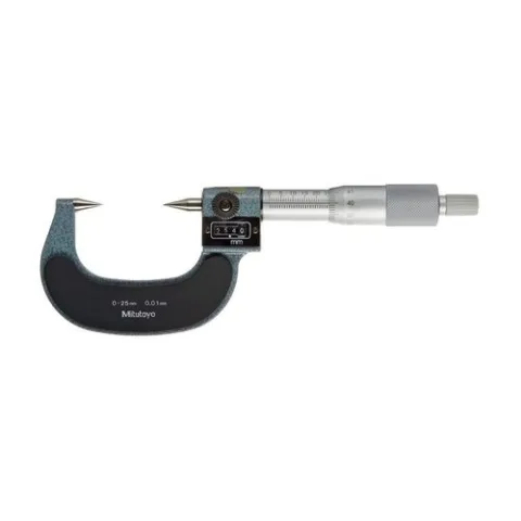 The Mitutoyo pointed micrometer utilizes pointed anvil and spline tips to measure small groves on parts or workpieces along with keyways. A mechanical digit counter displays readings to .0001" for easier viewing and recording. A ratchet-stop mechanism provides uniform pressure on a workpiece for precise, repeatable measurements.