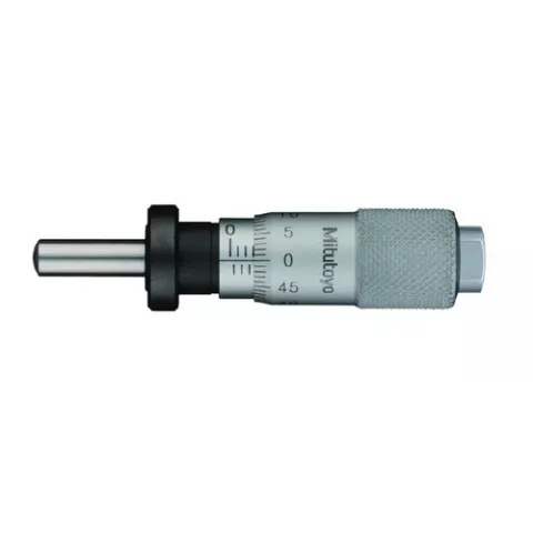 The Mitutoyo smaller-sized standard micrometer head is shorter in length and range with a smaller diameter for easier placement in machines and fixtures.