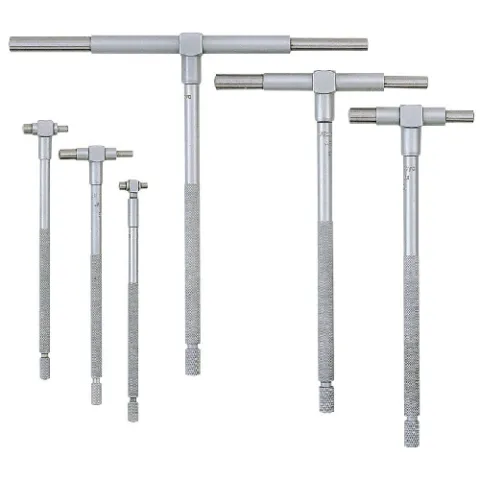 The Mitutoyo telescoping gage set allows measuring diameters of holes and openings quick, easy and accurate. Hardened steel plungers operate smoothly with a balanced spring, and each plunger has hardened contacts ground to a radius for true fit and measurements. These telescoping gages are used with outside micrometers for measuring inside hole and openings.
