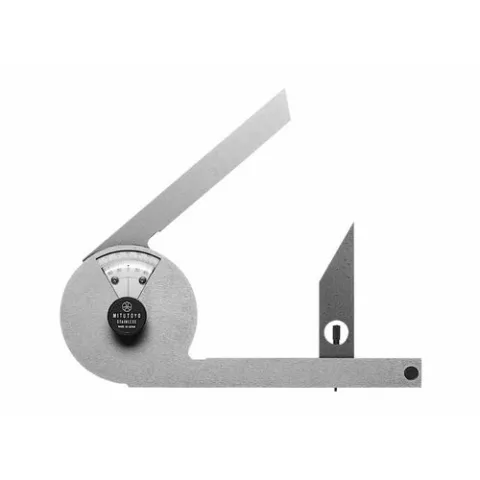 The Mitutoyo Bevel Protractor features a 0-90-0 blade with 1° angle increments and a Vernier scale with 5-minute increments for highly accurate angle measurements. The 30° and 60° blade edges provide quick angle reference, and the center knob locks the blade securely into position. The bevel protractor consists of three sheets of stainless steel, the middle one which is made for angle measurements.