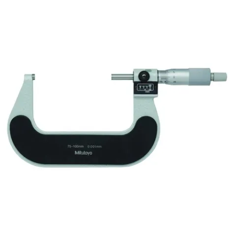 The Mitutoyo outside micrometer with mechanical digit counter features a ratchet-stop mechanism which provides uniform pressure on a workpiece for precise, repeatable measurements. The frame has a satin chrome finish for durability, and measurements on the thimble and conversions on the frame are laser etched for easier reading. A Vernier scale with slanted barrel markings to help reduce parallax errors provides highly accurate outside diameter measurements.