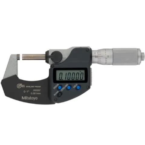 The Mitutoyo IP65 rated coolant-proof micrometer's ratchet stop thimble mechanism provides a constant measuring force on the spindle to ensure accurate, repeatable measurements. The combination of the ratchet thimble and speeder enables a rapid spindle feed when measuring widely different dimensions, as well as, easier one-handed measurements.
