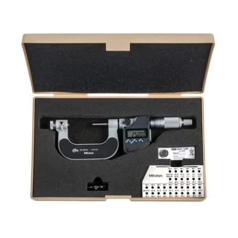 The digital Mitutoyo screw thread micrometer with interchangeable anvil and spindle tips uses optional V-anvil and conical spindle inserts interchangeably to precisely measure pitch diameters of metric or unified screw threads. A ratchet-stop mechanism provides uniform pressure on a workpiece for precise, repeatable measurements. Readings are displayed on an easy-to-read LCD readout.
