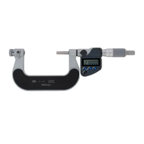 The digital Mitutoyo screw thread micrometer with interchangeable anvil and spindle tips uses optional V-anvil and conical spindle inserts interchangeably to precisely measure pitch diameters of metric or unified screw threads. A ratchet-stop mechanism provides uniform pressure on a workpiece for precise, repeatable measurements. Readings are displayed on an easy-to-read LCD readout.