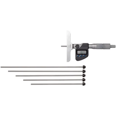 The Mitutoyo digital interchangeable rod type depth micrometer offers great versatility for measuring a range of depths with the included extension rods. The depth micrometer's rod contact measuring points are lapped and carbide tipped for incredible flatness and better precision. The ratchet stop mechanism provides uniform pressure for precise, repeatable measurements.