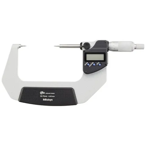 The Mitutoyo Digimatic pointed digital micrometer features 15-degree pointed anvil and spline to measure small grooves on parts or workpieces along with keyways and web thicknesses on drills with superior accuracy. The pointed anvil and spindle contacts are ideal at measuring small, hard-to-reach areas which a normal or reduce-diameter spindle and anvil are unable to access. A ratchet-stop mechanism provides uniform pressure on a workpiece for precise, repeatable measurements. Measurements are displayed on an easy-to-read LCD readout.