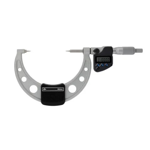 The Mitutoyo Digimatic pointed digital micrometer features 15-degree pointed anvil and spline to measure small grooves on parts or workpieces along with keyways and web thicknesses on drills with superior accuracy. The pointed anvil and spindle contacts are ideal at measuring small, hard-to-reach areas which a normal or reduce-diameter  spindle and anvil are unable to access. A ratchet-stop mechanism provides uniform pressure on a workpiece for precise, repeatable measurements. Measurements are displayed on an easy-to-read LCD readout.