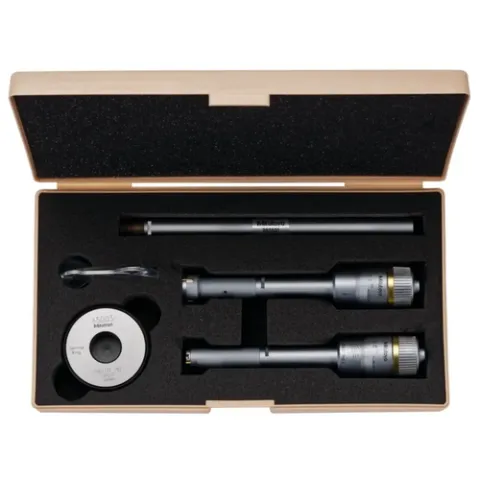 The Mitutoyo mechanical Holtest internal micrometer set includes complete gages (micrometer head units and measuring heads) for each size. Three hardened-steel anvils evenly spaced at 120° allow for true alignment of the axis bore for accurate, easily repeatable measurements. The holtest's ratchet stop mechanism provides a constant measuring force on the hardened-steel spindle to ensure accurate, even measurements.