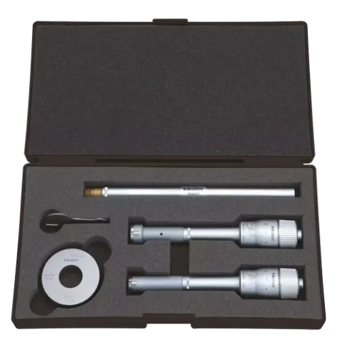 The Mitutoyo mechanical Holtest internal micrometer set includes complete gages (micrometer head units and measuring heads) for each size. Three alloy steel anvils evenly spaced at 120° for true alignment of the axis bore for accurate, easily repeatable measurements. Hardened steel spindles with a carbide ball and cones with a carbide pin ensure accuracy and durability when extending and retracting the anvils. The holtests ratchet stop mechanism provides a constant measuring force on the hardened steel spindle to ensure accurate, even measurements.