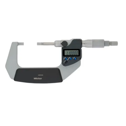 The Mitutoyo Digimatic blade micrometer utilizes a blade anvil and spindle for measuring difficult pieces such as groove diameters of shafts and keyways. The non-rotating spindle reduces torsion on softer parts being measured and prevents workpiece deformation and wear. A ratchet-stop mechanism provides uniform pressure on a workpiece for precise, repeatable measurements. Readings are displayed on an easy-to-read LCD readout.