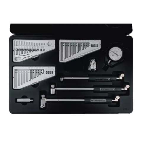 The Mitutoyo standard type bore gage set includes 26 interchangeable anvils, 10 spacers and 3 stems to measure a wide range of bore diameters with one Dial Indicator. A pendulum guide structure improves sliding the gage for measurements while a two-point contact system detects geometry anomalies such as ovalness and taper.