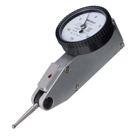 The Mitutoyo horizontal type dial test indicator with reversible measuring direction and adjustable contact point is ideal for measuring surface variations in narrow or recessed areas with high precision. The dial test indicator's one-piece movement provides high-impact resistance and better durability, while jeweled bearings deliver high sensitivity and quick response. The horizontal face is parallel to the axis of the indicator, and the indicator can be mounted either horizontally or vertically from the front, top or back of the indicator.