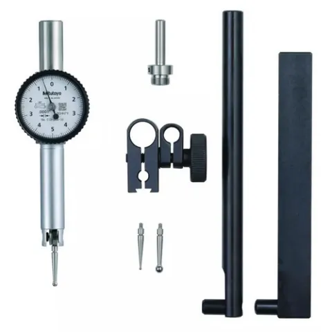 The Mitutoyo pocket dial test indicator has a reversible measuring direction and adjustable contact point to measure surface variations in narrow or recessed areas. The pocket type indicator has a horizontal face parallel to the axis, and three dovetail mounts allow for horizontal or vertical mounting from the front, top or back of the indicator. The indicator's one-piece movement provides high-impact resistance and better durability, while jeweled bearings deliver high sensitivity and quick response.