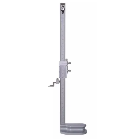 The Mitutoyo Vernier height gage slider and beam are constructed of hardened stainless steel and the beam is adjustable with a ring-type lock nut to support repositioning of the zero reference point. The hand-operated slider features a fine-adjustment carriage for precise feeding. The Vernier sliding scale provides measurements between marks on the main scale for ultra-precise readings.