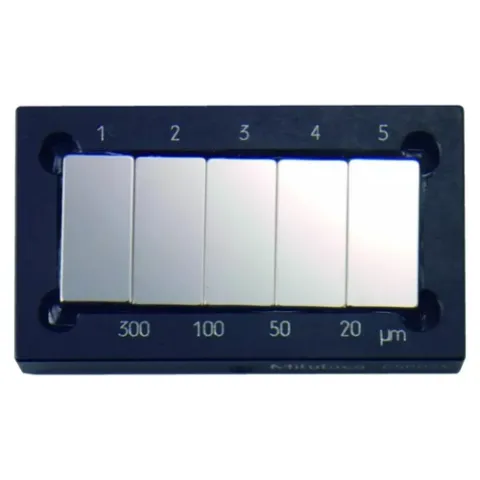 The Mitutoyo Step Master provides four small increments in height to calibrate the Z-axis of optical instruments. The Step Master is constructed from an assembly of five highly accurate steel gage blocks. Each adjacent step is measured down to 0.01 µm by using an interferometer within the ±0.20µm allowance.