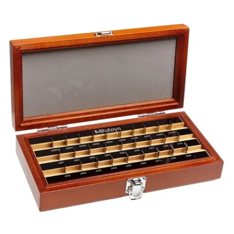 The Mitutoyo Inch Rectangular Gage Block Sets offer exceptional precision and stability for calibration and manufacturing traceability of standard-sized pieces. Gage block sets are offering exceptional precision and stability for calibration and manufacturing traceability. The Mitutoyo innovative lapping technique makes gage blocks some of the most accurate and trusted instruments in the world, featuring exceptional flatness and ideal surface roughness. Mitutoyo steel gage blocks are constructed of high-carbon, high-chrome steel and heated treated to resist warping and other deformations.
