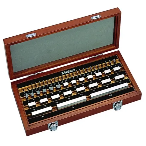 The Mitutoyo Metric Rectangular 1 mm Base Gage Block Sets are offering exceptional precision and stability for calibration and manufacturing traceability. Mitutoyo's innovative lapping technique makes gage blocks some of the most accurate and trusted instruments in the world, featuring exceptional flatness and ideal surface roughness. The Mitutoyo steel gage blocks are constructed of high-carbon, high-chrome steel with superior surface qualities and corrosion resistance.