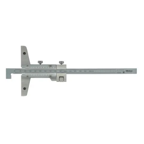 The Mitutoyo Vernier Hook-End Type Depth Gage attains depth and thickness measurements of a projected portion or line in a hole in addition to standard depth measurements.