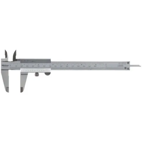 The Mitutoyo Vernier caliper features a 14-degree face angle for easier reading and helps prevent parallax error in the measurement. The scales are raised to slide easily and protect the graduation markings. The Vernier caliper is constructed of hardened stainless steel that is corrosion resistant and a satin chrome finish reduces glare.