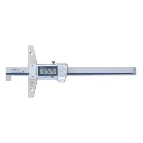 The Mitutoyo ABSOLUTE Digimatic hook-end type depth gage is designed to take thickness measurements of a projected portion or lip in a hole, as well as, standard depth measurements. Measurements are displayed on a digital LCD readout with SPC output for easy automatic recording.