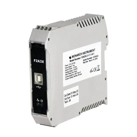 The F2A3X Frequency to Analog Converter is a DIN rail module that converts a frequency input signal into a proportional analog voltage (0-5 Vdc) or current (4-20 mA) output. The output signal is electrically isolated from the input signal and input power source, effectively eliminating troublesome ground loops. The input signal can be supplied from a Monarch sensor (measuring RPM for example) or any source of digital signal not exceeding 12 volts. The F2A3X is completely user-programmable using the free downloadable PM Remote Software. A NIST Traceable Certificate is included.
