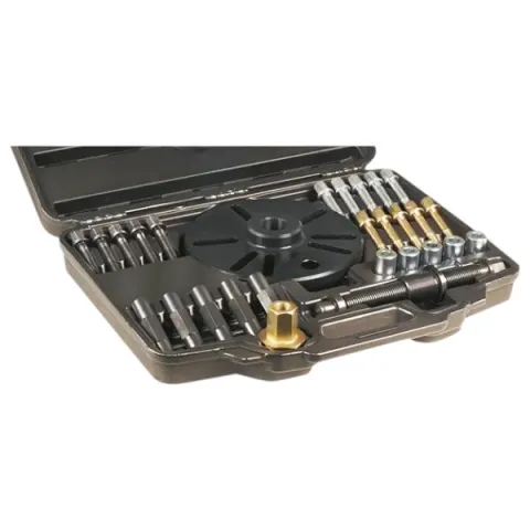 This versatile tool can be used with a slide hammer or hydraulic spindle and is compatible with 5 or 6-hole wheels with wheel studs sizes M14 and M16x1.5, as well as 5 or 6-hole wheels with wheel bolt sizes M12x1.5, M14, and M14x1.5.
