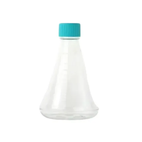 Erlenmeyer flasks are ideal for suspension cell and bacterial cultures, and are also well-suited for medium preparation, mixing, and storage. A baffled bottom enhances gas exchange and oxygen dissolution in the culture medium, but may also increase shear stress on cells. Individually packaged in sterile bags. An injection-molded scale on the flask body allows easy monitoring of liquid volume.