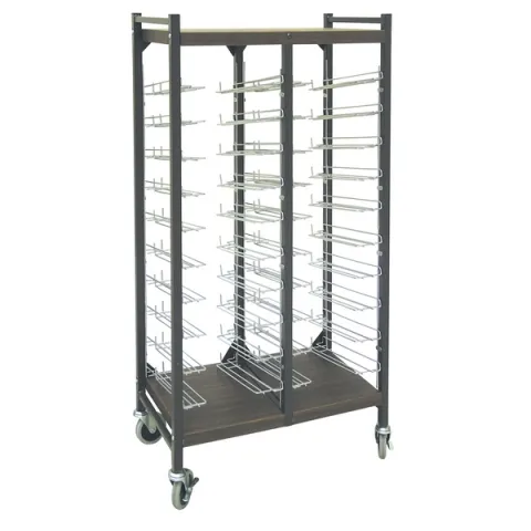 Welded steel frame and coated wire organizers. Organizers hold charts on slight angle for easy I.D. and retrieval. Racks have a universal design that allows storage of top and side chart binders in the same rack.