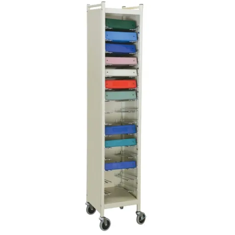 Welded steel frame and coated wire organizers. Organizers hold charts on slight angle for easy I.D. and retrieval. Racks have a universal design that allows storage of top and side chart binders in the same rack.
