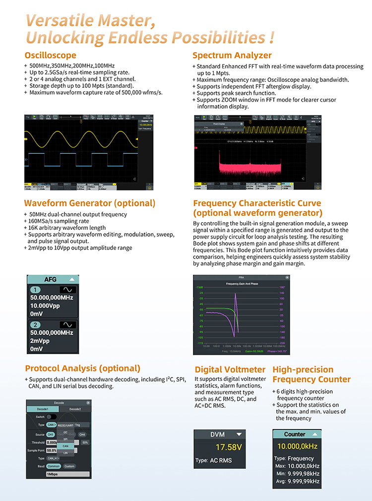 - Integrates oscilloscope, dual-channel 50MHz AFG (optional), frequency counter, voltmeter, FFT spectrum analyzer and protocol analyzer.