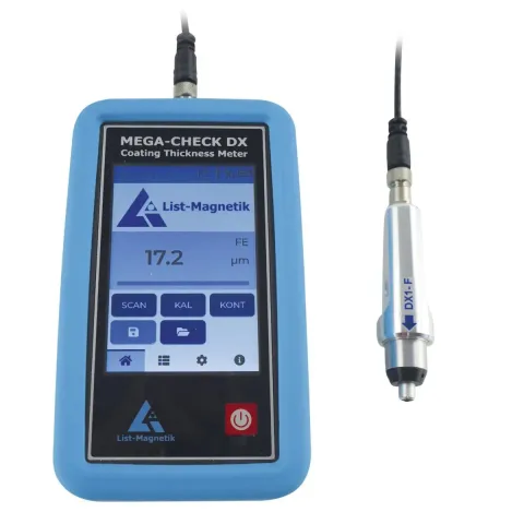 The integrated scan function allows rough surfaces to be scanned with subsequent statistical evaluation. An analogue bar graph display supplements the numerical measured values and enables trends or deviations to be identified quickly. The duplex function simultaneously measures the individual layer thicknesses of insulating coatings on galvanized steel (only in conjunction with the DX52-D or DX52-DP probes).