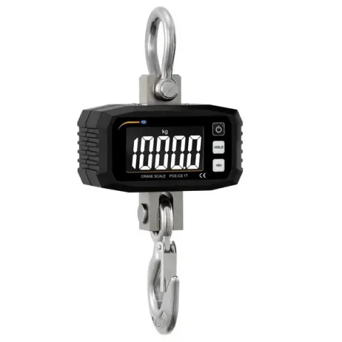 The crane scale has a measuring range of 0 … 1000 kg / 2204 lb and a resolution of 0.1 kg. With an accuracy of 1% of the measuring range, the crane scale is also a precise measuring device. This is why the crane scale is used, for example, when weighing raw materials. The backlit LC display on the digital crane scale has a digit height of 30 mm and can be easily read from a large distance. In addition to the kg display, the digital crane scale can also display the attached weight in lb and in N.