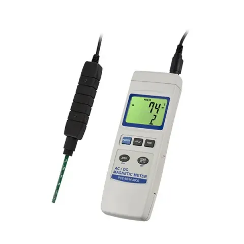 PCE-MFM 3000 is a handheld electromagnetic field meter or gauss meter that detects both static (DC) permanent magnet (rare earth) magnetic and dynamic (AC) electromagnetic fields (EMFs) and displays measurement results in gauss (G) or milli Tesla (mT). This portable magnetic field measuring device comes with an external sensor and features an RS-232 port for downloading data to a PC.