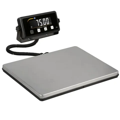 The platform scale with a maximum weighing range of up to 75 kg and a weighing surface of 350 x 390 mm is the ideal measuring device for determining the weight of parcels or the contents of propane gas bottles. With an accuracy of ± 0.06 kg, the platform scale is a precise measuring device. Furthermore, the platform scale can be used for the dosing of paints. This makes the platform scale a universally applicable test device in production, warehouse and logistics.