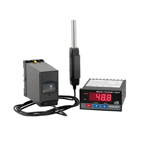 PCE-SLT is a class II (type 2) sound level, sound pressure level (SPL), decibel (dB) or noise meter with audible or visual alarm output capability. PCE-SLT is used for long-term, continuous monitoring of occupational noise exposure limits in industrial environments such as foundries, factories and manufacturing production floors. The measuring device consists of a wall-mountable acoustic sensor on a 1.5 m / 4.92' long cable and a transmitter.