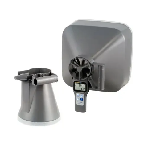 PCE-VA 20-SET is a environmental tester with capture hoods for assessing and balancing heating, ventilation and air conditioning or cooling (HVAC) systems. In addition to measuring air flow velocity (i.e., wind speed), this environmental tester measures volume flow, relative humidity (RH), air temperature, dew point temperature and wet-bulb temperature. This environmental tester features a 10 cm / 3.9" Ø fan impeller, easy-to-read backlit LCD, and functions such as display hold, average value, maximum value, minimum value, battery-saving automatic power off, low-battery indicator, and metric or imperial unit selection.