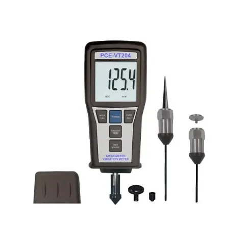 The PCE-VT 204 is a multifunction handheld vibration meter for condition monitoring. The vibration meter has the ability to accurately measure both rotation and vibration. An ideal tool for the testing and inspection of machine parts and components such as motors, transmissions, gears, gear boxes and wheels, this multi-purpose device measures revolutions per minute (RPMs) as well as three-axis vibration, i.e., velocity or speed, displacement and acceleration.