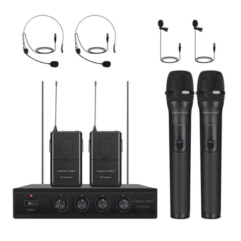 Phenyx Pro PTV-2000-2H2B VHF Fixed Frequency Quad Wireless Microphone System 2x Wireless Handheld Microphones 4-Channel Receiver 2x VHF Bodypacks