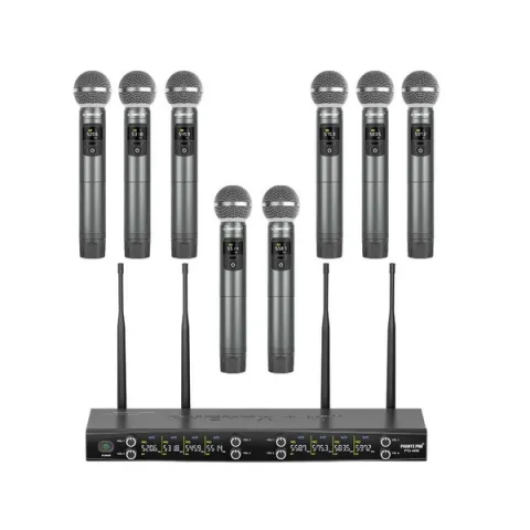The Phenyx Pro PTU-4200-8H is a UHF 8-channel wireless microphone system crafted for professional settings such as karaoke, live shows, church services, and outdoor events. With 8x20 selectable frequencies, automatic pairing, and up to 200 ft of wireless range, it ensures stable and flexible audio transmission for demanding multi-mic setups.