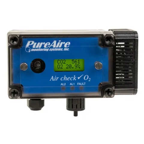 PureAire Monitoring System’s Dual Oxygen/Carbon Dioxide Monitor provides continuous monitoring of oxygen and carbon dioxide. This monitor is ideal for use in confined spaces where low oxygen concentrations could pose a health hazard, from nitrogen gas storage sites to carbon dioxide beverage gas distribution areas.