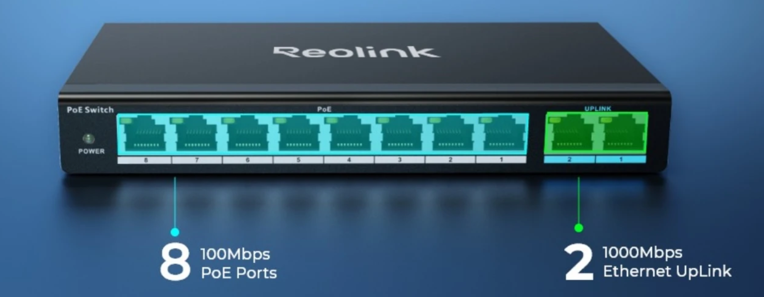 Reolink RLA-PS1 provides a reliable PoE solution featuring 8 PoE+ ports (10/100Mbps) and 2 Gigabit Ethernet uplink ports (10/100/1000Mbps). Compliant with IEEE802.3af/at standard, it can deliver up to 30W for each PoE port and has a total power budget of 120W for at most 8 PoE devices.