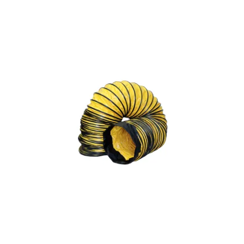 Industry-standard quality ducting for everyday use. Operating temperature range from -30°F to 150°F. Single-ply PVC vinyl-coated polyester fabric with 15-gauge spring steel wire helix and external PVC wearstrip. PVC-coated polyester fastening cuffs at both ends with industry-standard spring buckle cinches. Flame resistant.