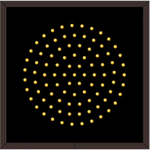 This TCL Series Indicator Dot, Single, 8 in dia, Amber (120-277VAC) outdoor, blank-out sign is designed with super bright LEDs and a contrasting face; we guarantee it's readable in direct sunlight. The sign message is formed by visible LEDs on a black sign face and is designed to illuminate the message(s) when turned on and blank out or extinguish the message when off.