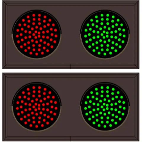 This TCL Series Indicator Dots, Double with Hood, Horizontal, 4 in dia, Green - Red outdoor, blank-out sign is designed with super bright LEDs and a contrasting face; we guarantee it's readable in direct sunlight. The sign message is formed by visible LEDs on a black sign face and is designed to illuminate the message(s) when turned on and blank out or extinguish the message when off.