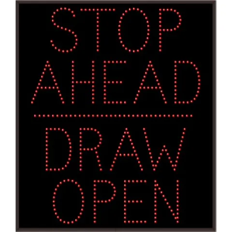 This TCL Series STOP AHEAD ---- DRAW OPEN (120-277VAC) outdoor, blank-out sign is designed with super bright LEDs and a contrasting face; we guarantee it's readable in direct sunlight. The sign message is formed by visible LEDs on a black sign face and is designed to illuminate the message(s) when turned on and blank out or extinguish the message when off.
